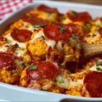 A creamy, cheese-loaded casserole that combines the heartiness of pizza with the comfort of biscuits, perfect for busy days.