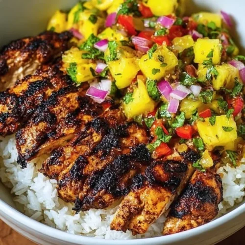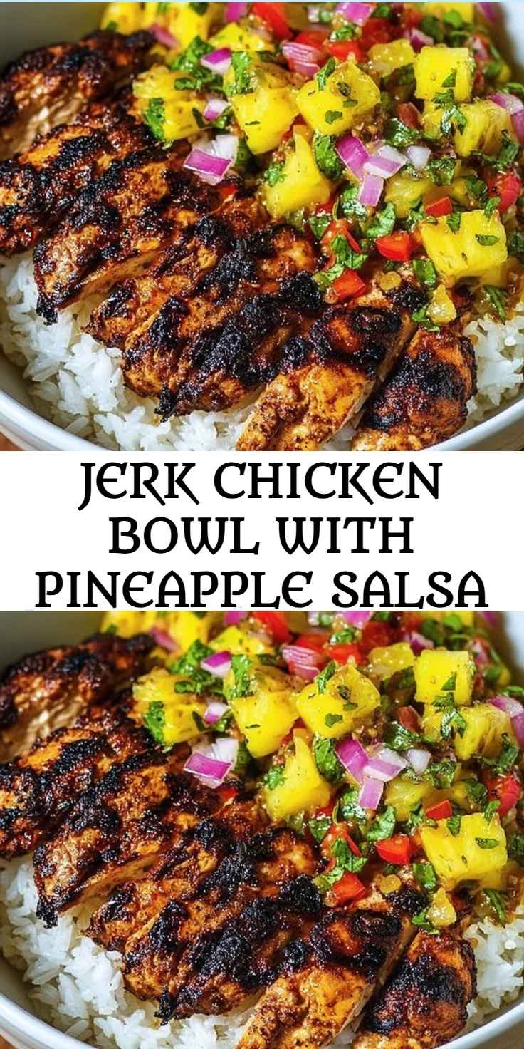 A flavorful and nutritious bowl featuring grilled jerk chicken and a refreshing pineapple salsa, perfect for busy family nights.