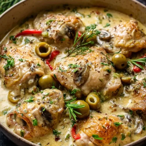 Whether you’re a busy parent juggling a hectic schedule or someone looking to whip up a nutritious meal in minutes, this dish checks all the boxes. The creamy sauce envelops each bite of tender chicken, creating a symphony of flavors that your family will rave about. The inclusion of green olives adds a delightful briny kick, while the sweet peppers bring a burst of color and taste that makes this dish as beautiful to look at as it is to eat.