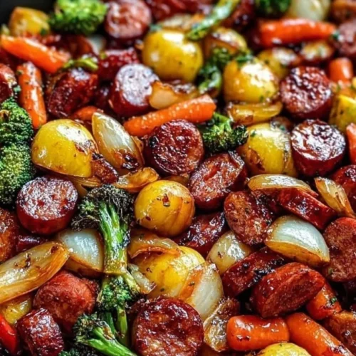 - Check for a caramelized, golden finish on the kielbasa and tender veggies.