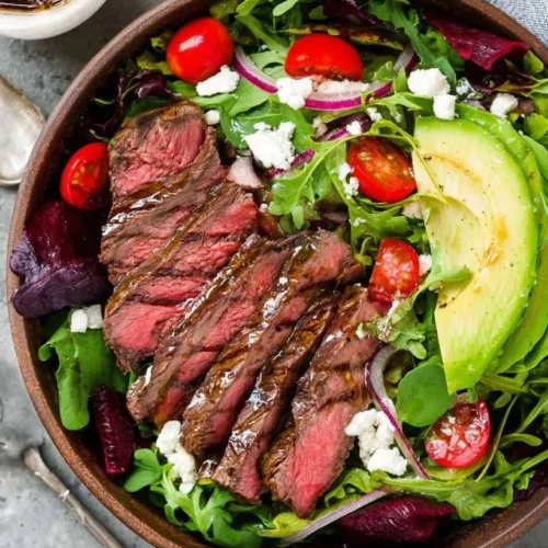This steak salad is deliciously satisfying while being a breeze to prepare, perfect for those aiming for a healthy diet without sacrificing flavor. It combines tender steak with fresh greens and a tangy balsamic vinaigrette, making it a go-to recipe for any night of the week.