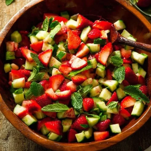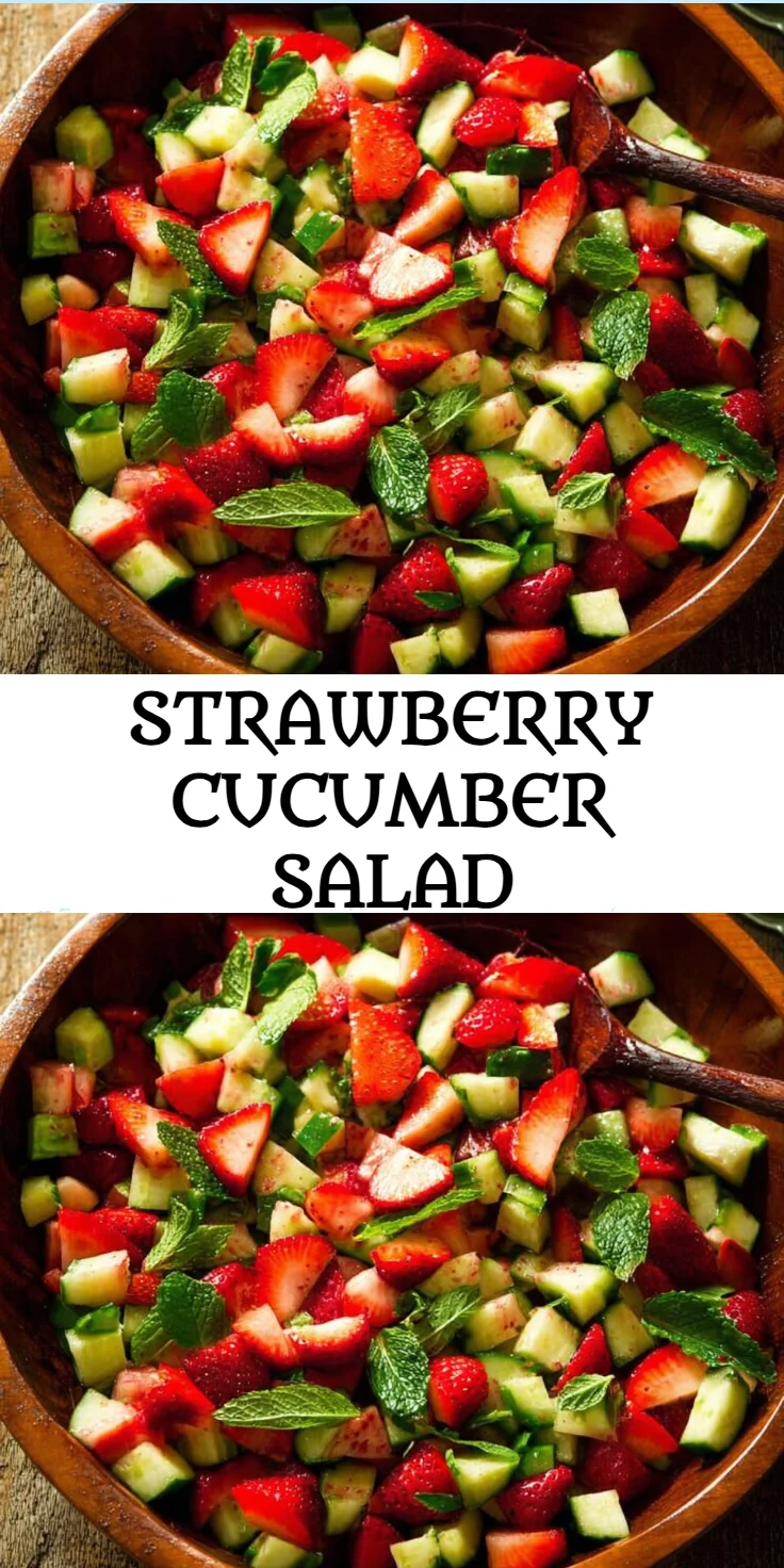 A refreshing and vibrant salad that combines sweet strawberries, crisp cucumbers, and fresh mint, all drizzled with a tangy balsamic dressing.