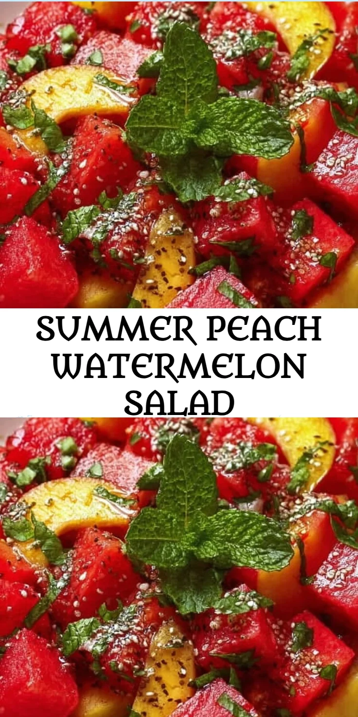 A refreshing summer salad featuring juicy peaches, sweet watermelon, fresh mint, and a splash of lime, perfect for barbecues or as a light side dish.