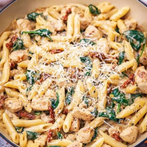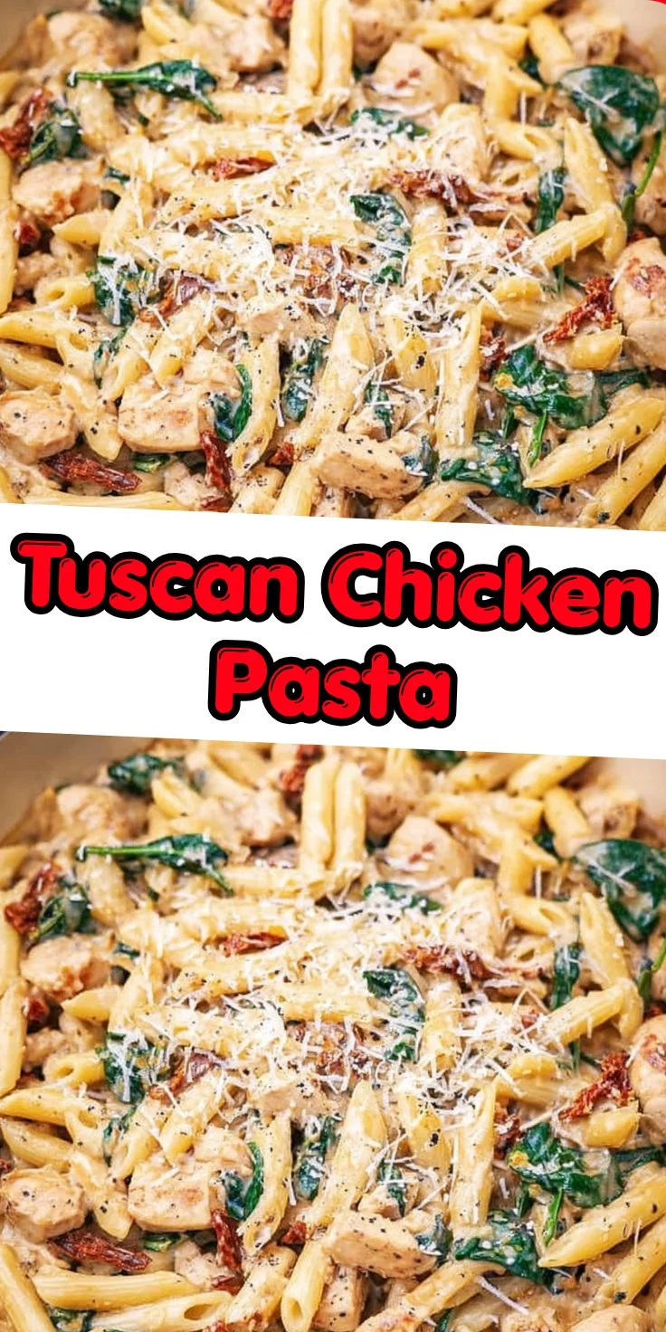 A creamy and hearty Tuscan Chicken Pasta dish with sun-dried tomatoes and fresh spinach, perfect for busy weeknights.