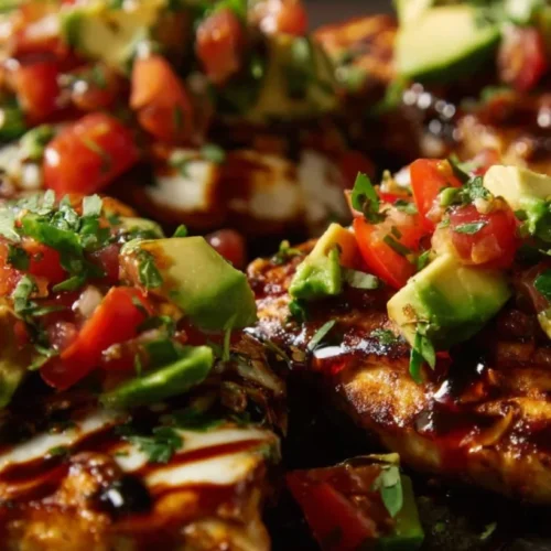 Indulge in a creamy and healthy dish combining grilled chicken breasts, fresh avocados, and melted mozzarella for a nutritious comfort meal.